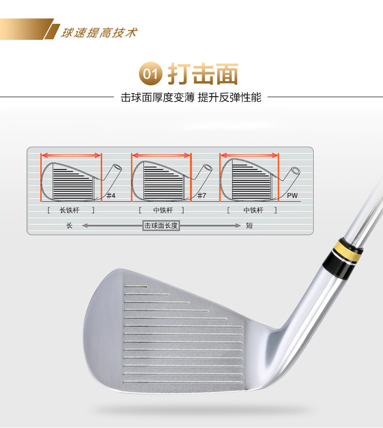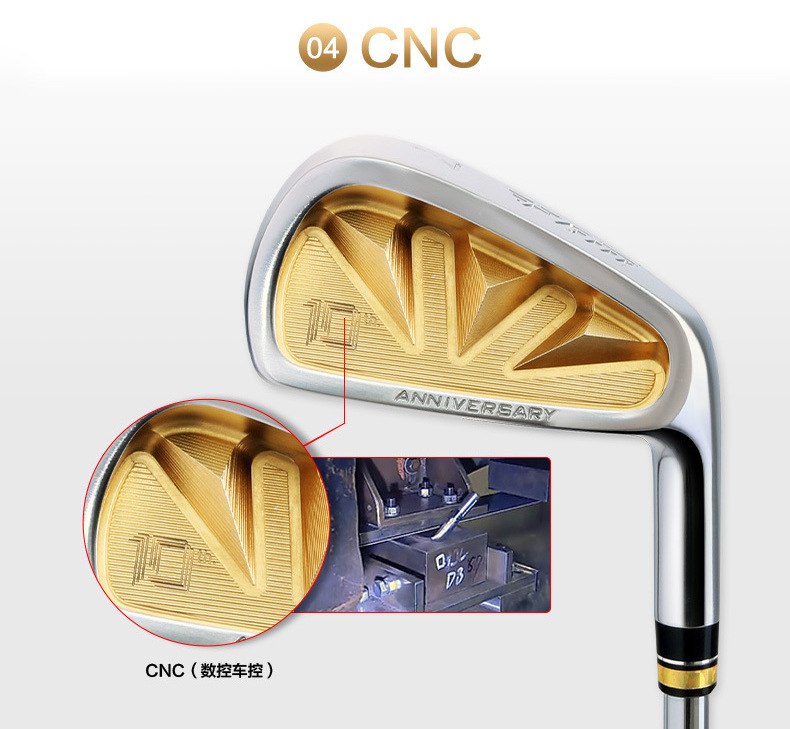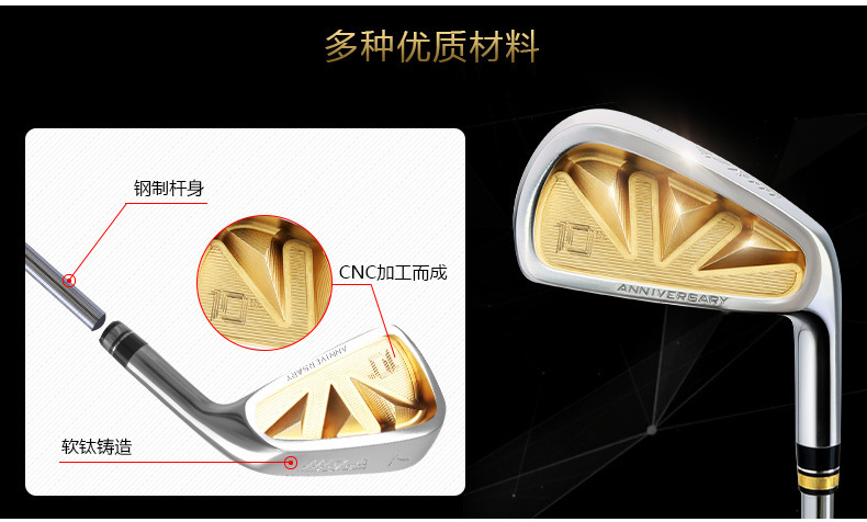Gậy Iron: Mặt gậy được làm bằng Thép đúc nguyên khối và mạ Crom cứng chống gỉ, Ngoài ra mặt gậy còn sử dụng công nghệ CNC tiên tiến tạo lên bề mặt gậy những đường nét vô cùng tinh xảo, được phủ lớp sơn tĩnh điện công nghệ cao, Cán gậy được làm bằng Graphite (Carbon), Tay cầm được làm bằng Cao Su.