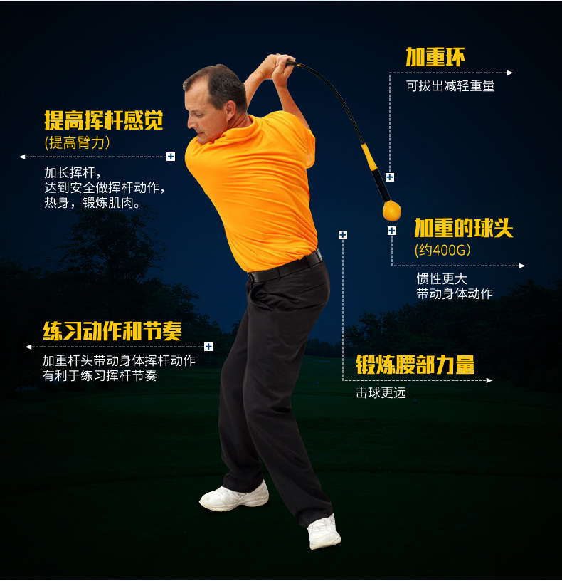- Đầu xoay hình quả bóng Golf đầu bóng nặng hơn (400 gram) cải thiện cảm giác vung và cải thiện sức mạnh của cánh tay. Tập luyện cơ eo. Sử dụng chất liệu Silicone mới thân thiện với môi trường, không độc hại, không mùi.