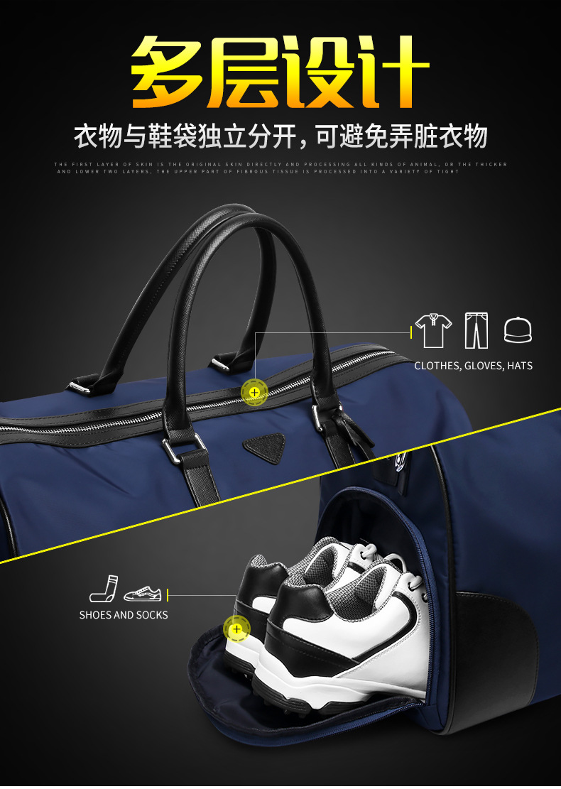- Dung tích lớn, ngăn lớn chứa quần áo và nhiều phụ kiện Golf. Hông túi là ngăn đựng giày riêng biệt tránh làm bẩn khi để chung với quần áo.